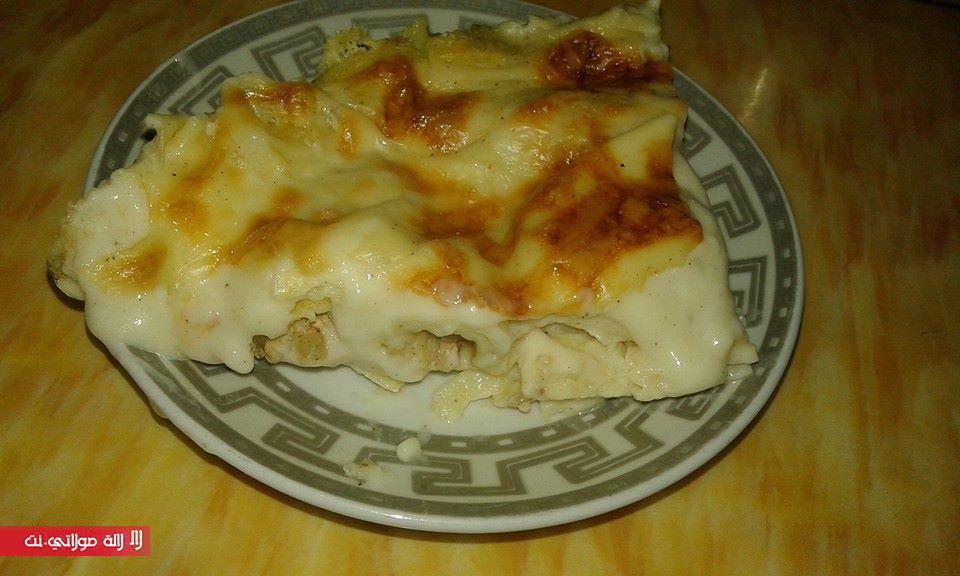 ناخذ صفيحة مذهونة بالزبدة ونقوم بحضو الكريب ولفه وتقطيعه الى نصفين ووضعها بالصينية ونصب خليط البيشاميل ونرش الوجه بالجبن المبشور وتدخل الفرن حوالي ربع ساعة