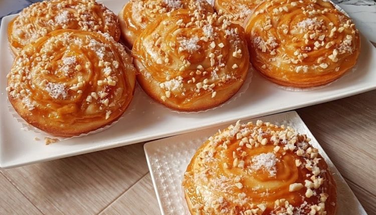 المكونات بيضة ربع كاس سكر ربع كاس زيت ملح فانيلا ملعقة متوسطة خميرة الخبز كاس الا ربع حليب دافئ 250 غ دقيق ابيض مكونات الكريمة كاس عنبة حليب ملعقة كبيرة بودرة الكريم باتسيير ملعقة كبيرة نستلي كراميل للتزيين مربى+ لوز مهرمش