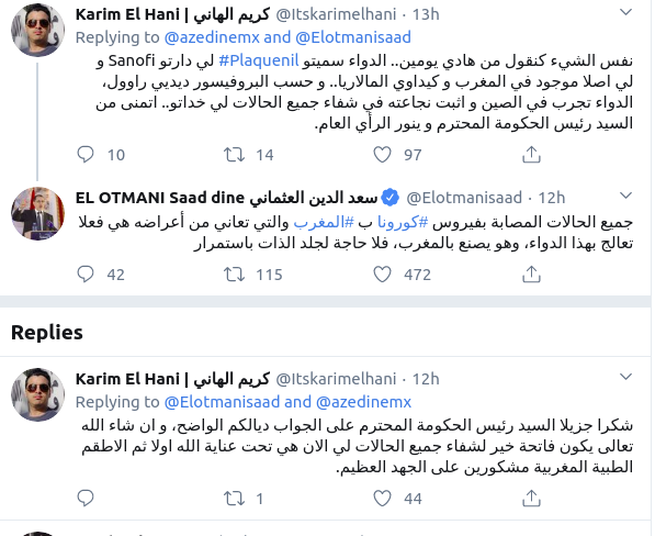 تعليق العثماني عبر حسابه الشخصي الموثق في “التويتر” جاء ردا على تفاعل كريم الهاني الذي أفاد بأنه “نفس الشيء كنقول من هادي يومين.. الدواء سميتو #Plaquenil لي دارتو Sanofi و لي اصلا موجود في المغرب و كيداوي الملاريا.. وحسب البروفيسور ديديي راوول، الدواء تجرب في الصين وأثبت نجاعته في شفاء جميع الحالات لي خداتو.. اتمنى من السيد رئيس الحكومة المحترم ينور الرأي العام”.