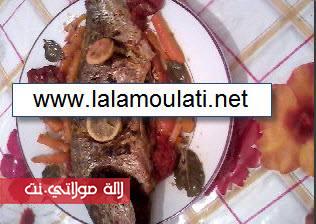 ناخد اناء الفرن نفرشه بالجزر المسلوق نصف سلقة+اوراق سيدنا موسى ثم نضع السمكة و نصفف قطع الطماطم نزين بقطع الحامض ثم نسقي بالقليل من الماء الدي سلقنا فيه الجزر وندخله الفرن الساخن ونراقبها .