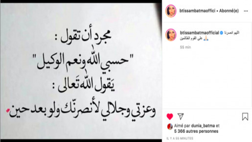 وكتب في إحدى الصور: “مجرد أن تقول حسبي الله ونعم الوكيل، يقول الله تعالى، وعزتي وجلالتي لأنصرنكم ولو بعد حين”، وجاء في تعليق مرافق لها: “اللهم انصرنا على القوم الظالمين”.