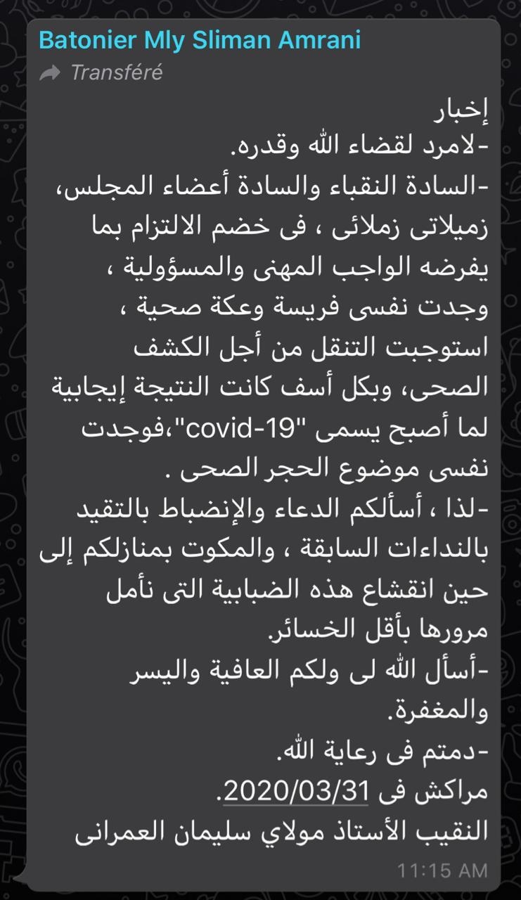 تأكدت إصابة نقيب المحامين بمراكش سليمان العمراني بفيروس كورونا (كوفيد-19) بعدما اجراءه لتحاليل طبية بالمستشفى العسكري بمدينة مراكش.