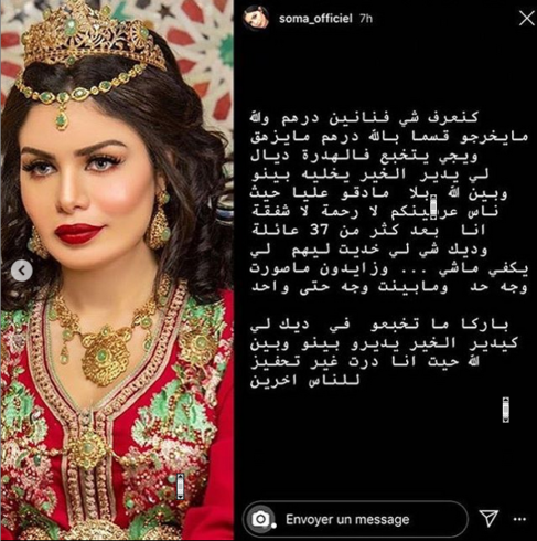 وجاء رد المغنية سوما عبر ستوري بعد أن إعتبرت أن الكلام موحه لها، وقالت أنها تعرف فنانين لا علاقة لهم بفعل الخير، وأنها قدمت المساعدة ل37 عائلة بدون إظهار وجه أحد. وأن من ينتقذ هذه الطريقة في تحقيز الناس للقيام بمساعدات إنسانية هو فقط يختبأ وراء كلامه لعدم قيامه بنفس الأمر.