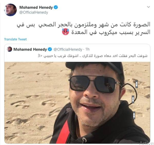 ولكن هنيدي كان حريصاً على توضيح الأمر لجمهوره، وغرد قائلًا: “الصورة كانت من شهر وملتزمون بالحجر الصحي بس في السرير بسبب ميكروب في المعدة”، ليتلقى عشرات التعليقات من جمهوره الذي تمنى له الشفاء العاجل وعبروا عن قلقهم الشديد عليه.
