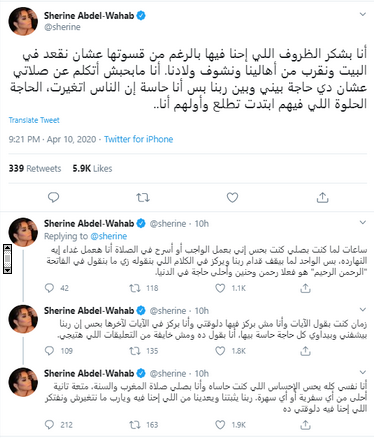 وقالت شيرين عبد الوهاب في سلسلة من التغريدات عبر حسابها بموقع تويتر: أنا بشكر الظروف اللي إحنا فيها بالرغم من قسوتها عشان نقعد في البيت ونقرب من أهالينا ونشوف ولادنا. أنا مابحبش أتكلم عن صلاتي عشان دي حاجة بيني وبين ربنا بس أنا حاسة إن الناس اتغيرت، الحاجة الحلوة اللي فيهم ابتدت تطلع وأولهم أنا.