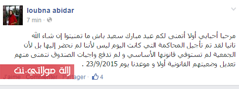 تانيا لقد تم تأجيل المحاكمة التي كانت اليوم ليس لأننا لم نحضر إليها بل لأن الجمعية لم تستوفي قانونها الأساسي و لم تدفع واجبات الصندوق نتمنى منهم تعديل وضعيتهم القانونية أولا و موعدنا يوم 23/9/ 2015”.