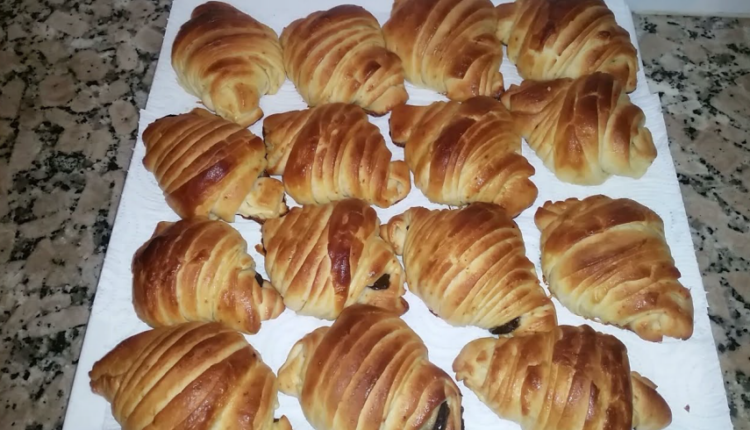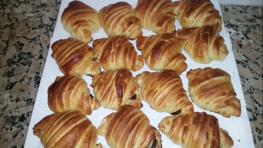 المكونات : كأس ماء دافي كأس حليب دافي نصف كأس زيت 4 ملاعق كبيرة سكر 2 ملاعق صغيرة ملح ملعقة صغيرة خميرة الخبز بياض بيضة ملعقة صغيرة من الفنيلا دقيق أبيض حسب الخلايط ( تقريبا 7 كؤوس أو أكثر حسب نوعية الدقيق المستعمل ) 200غ من الماركارين الخاصة بالتوريق 3 ملاعق كبيرة نشا الذرة أو الدقيق الأبيض ملعقة صغيرة من البكينج باودر ( خميرة الحلويات ) عدد القطع المحصل عليها : 24 قطعة