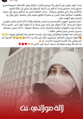 وشاركت الصديقي تجربتها مع متابعيها، من خلال صفحتها الرسمية على موقع فايسبوك، وقالت: “واحد النهار جاوني شي أعراض وأنا بوحدي فالدار، وكانوا بعض الأصدقاء، مخرج صديق وصحبتي وواحد الدكتور من الرباط، كايسولوا فيا مرتين إلى ثلاثة فاليوم، واحد الخطرة اتصل بيا الدكتور يسول فيا، من بعد ماقطعت المكالمة معه، وكان منتصف الليل وقال ليا بالحرف وهو كيغوت عليا: منال، ضميري المهني ماكيسمحش ليا ننعس ونخليك هكذا، دآآبا غادي تمشي للطبيب”.