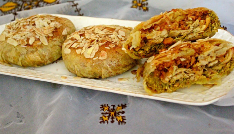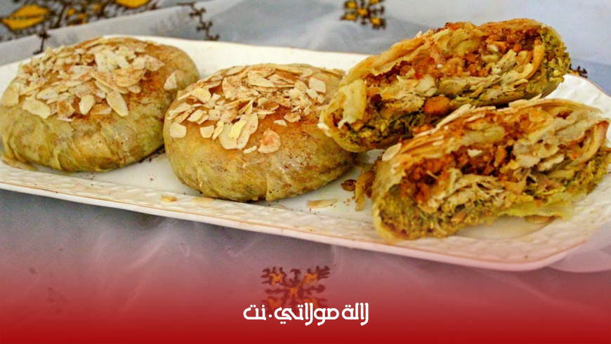 المقادير كيلوغرام ونصف دجاج او 2 كيلو 1 كلغ ونصف بصل زيت زيتون وزيت نباتية ملح ملعقة كبيرة سمن ملعقة صغيرة مملوءة زنجبيل ملعقة صغيرة غير مملوئة فلفل اسود ملعقة صغيرة كركم ملعقة صغيرة قرفة قليل زعفران الحر شعرة باقة صغيرة بقدنوس 6 حبات بيض لوز محمص مجروش 100 غ سكر ناعم ملعقة صغيرة قرفة القليل من مستكة /مسكة حرة 3م ملاعق طعام ماء الزهر اوراق البسطيلة زبدة مدابة اصفر بيضة