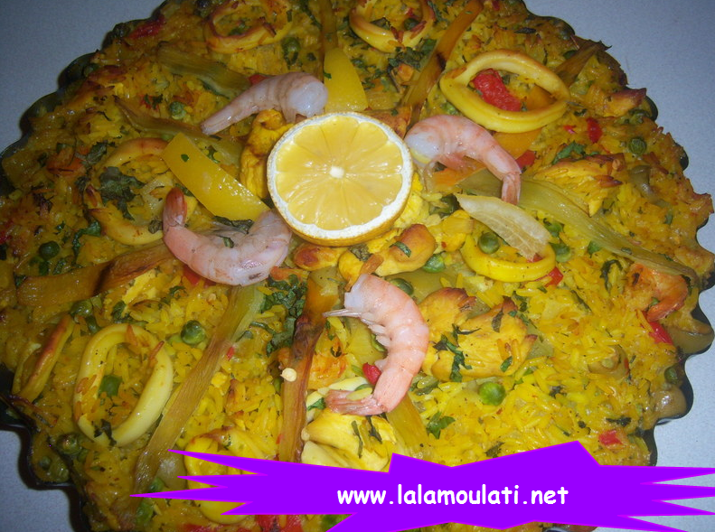 او نزيد عليها دجاج يتشحر معها او نزيد شوية د ربيع او توماحتة يطيب ديك دجاج شوية او نحيده او ديك البصلة نزيد عليها مطشة مقاطعة او فلفلة حمرة مقاطعة او نشحرهم او نزيد عليهم ربيع أنا محيط معنديش ديك لمقلة لكبيرة الغارقة مغتصدنش بش نزيد روز قلبت هادشي ف طاوة او غيتب بحيلة ف لمقلة لكبرى لمهم مني بدا مطشة او فالفله طيح زدت علهم رز او زدت لما حيت غتنشف او زدت عليه ديك دجاج او فواكه البحر او crevettes او calamard او خليط كلشي يطيب واحد 15 من على ميبنلنة روز طاب او او نزيد توما او ضمة د البنة او ندرو العطرية او تتقرب طب بش نديرها ف فران عد نزيد شويي د القرفة راس معلقة او نقلب كلشي ف لاطا لغدخل الفران او نصطف calamard فوق غي شي وحدات منو بش يجي لمنضر زوين او الفليفلة خضرة شويتها أو 9liwha او نقطع ترففات طوال او نذوق بها من الفوق او نزوق ب-crevettat ف لوسط او ندخلهل فران واحد 20 دقيقة