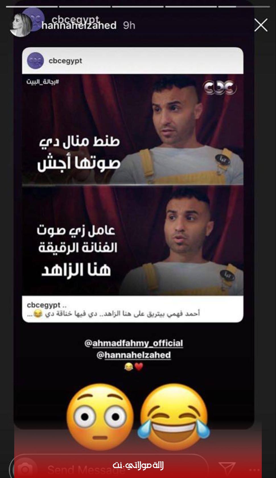 ومن جانبها، علقت هنا الزاهد على مشهد سخرية زوجها أحمد فهمي من نبرة صوتها، من خلال نشر صورة عبر خاصية “ستوريز” على انستقرام من المشهد والحوار الذي دار فيه ووضعت “إيموجي” يعبر عن الصدمة والضحك من جراء السخرية.