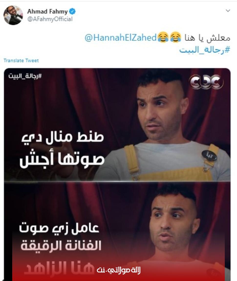 اعتذر الفنان احمد فهمي من زوجته الفنانة هنا الزاهد بعد سخريته من نبرة صوتها، من خلال مشهد في مسلسله “رجالة البيت”.حرص أحمد فهمي على ممازحة زوجته هنا الزاهد بعد سخريته من صوتها في الحلقة الثامنة من مسلسل “رجالة البيت”، من خلال نشر صورة من المشهد عبر حسابه على تويتر وعلق عليها: “معلش يا هنا” مع وضع “إيموجي” يضحك بشدة.