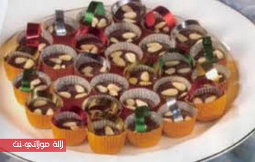 نضع كويرات الحلوى في الشكلاط الذائب ثم في اللوز المطحون