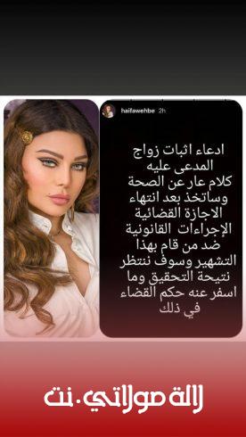 وكتبت هيفاء وهبي عبر حساباتها على مواقع التواصل: “ادعاء اثبات زواج المدعى عليه هو كلام عار عن الصحة وساتخذ بعد انتهاء الاجازة القضائية الإجراءات القانونية ضد من قام بهذا التشهير وسوف ننتظر نتيجة التحقيق وما أسفر عنه حكم القضاء في ذلك”.