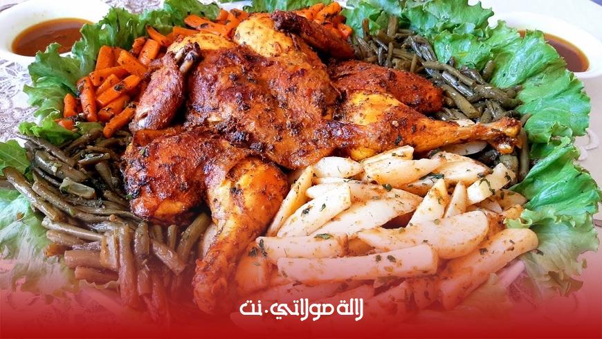 الخضر المرافقة:كمية من الفاصولياء (اللوبيا)+جزر+بطاطس+زيت الزيتون+قزبرة ومعدنوس مفرومين+التوابل: كمون – فلفل أسود – فلفل أحمر+ثوم مجفف+ملح.