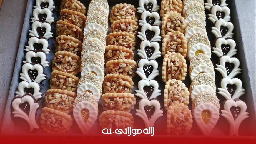 المكونات :125 غ زبدة+كأس الا ربع سكر حبيبات او 120 غ+نصف كأس زيت او 80 غ+بيضة+فانيلا+قبصة خميرة حلويات+ملح+400 غ طحين+2 ملاعق كبيرة جوز هند كراميليزي+فلان كراميل+شكلاطه سوداء+شكلاطه بيضاء+مربى المشمش+گليكوز+ناباج