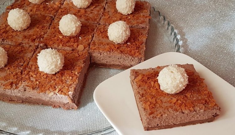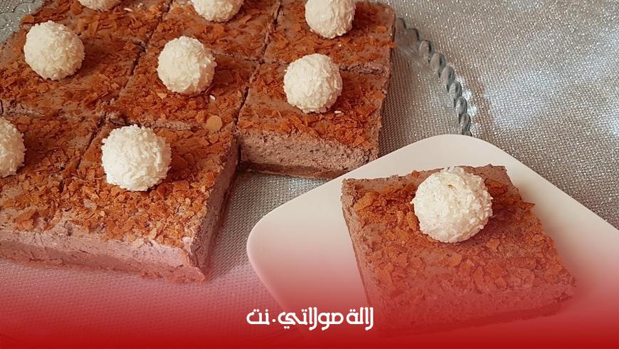 المكونات الطبقة الاولى 300 غ بسكوي مطحون 160 غ دانيت شوكولا الطبقة التانية 8 قطع جبن كيري 200 مل كريمة سائلة 150 غ شوكولا سوداء للتزيين فيوتين.