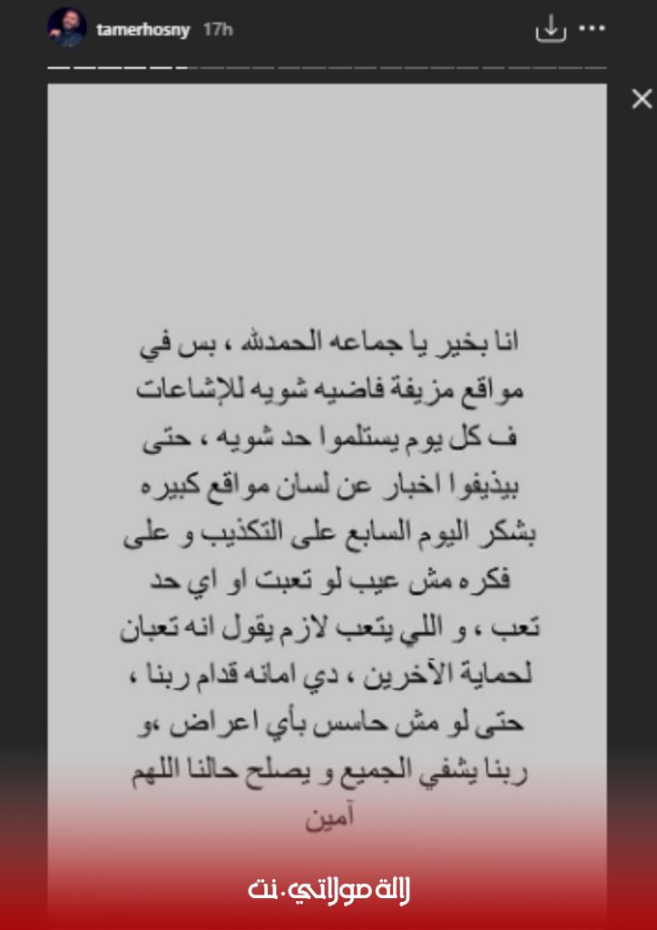 وكذب حسني هذه الأخبار المفبركة يوم أمس الثلاثاء، عبر خاصية الستوري على حسابه الرسمي بموقع تبادل الصور والفيديوهات، أنستغرام، وكتب : “أنا بخير يا جماعة الحمد لله، بس فى مواقع مزيفة فاضية شوية للاشاعات فى كل يوم يستلموا حد شوية، حتى يزيفوا أخبار عن لسان مواقع كبيرة، بشكر اليوم السابع على التكذيب وعلى فكرة مش عيب لو تعبت أو أى حد تعب، واللى يتعب لازم يقول أنه تعبان لحماية الآخرين، دى أمانة قدام ربنا، حتى لو مش حاسس بأى أعراض، وربنا يشفي الجميع ويصلح حالنا اللهم آمين”.