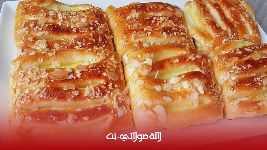 المكونات 300 غ دقيق بيضة 40 غ زبدة ملعقة كبيرة سكر ملعقة متوسطة خميرة الخبز ملح + فانيلا كاس الا ربع حليب الكريمة كاس ونصف حليب ملعقة كبيرة ونصف بودرة الكاسترد ملعقة كبيرة ونصف سكر للتزيين اصفر بيضة + حليب+خل لوز ايفيلي ناباج او مربى.