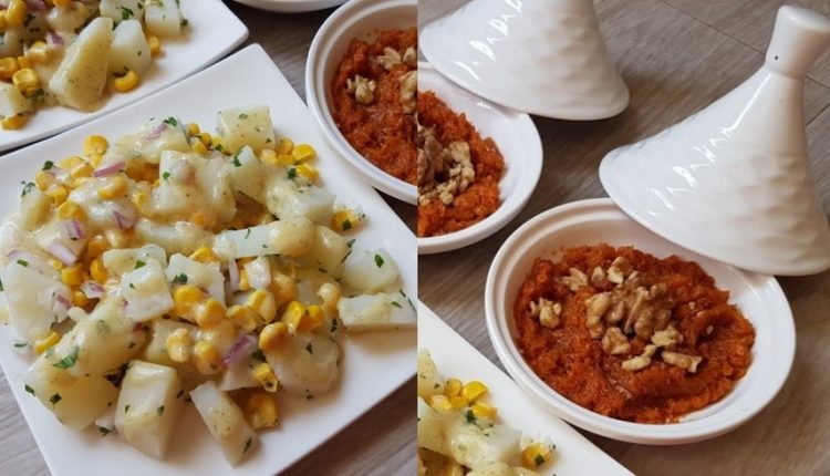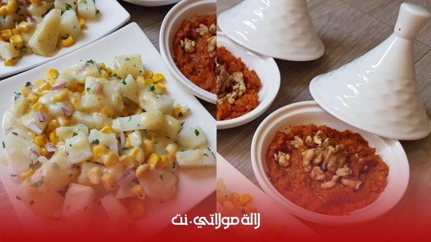 مكونات سلطة البطاطس 3 حبات بطاطس مبخرة مع ملح كاس صغير ذرة معلب ملعقة كبيرة بصل مفروم ملعقة كبيرة عصير الحامض معدنوس ملعقة موطارد + ملح+ فلفل اسود ملعقتين كبار زيت مكونات القرع معسل نصف كيلو كرعة مبخرة وناشفة ملعقة كبيرة سكر ملعقة كبيرة زيت ملعقة صغيرة زبدة قرفة + مسكة حرة+ ملعقة متوسطة ماء الزهر رشة ملح جوز للتزيين.
