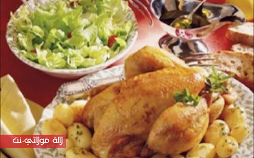 أدخلي الدجاجة إلى الفرن لمدة ساعة أو أكثر حتى تتحمر وتنضج البطاطس.