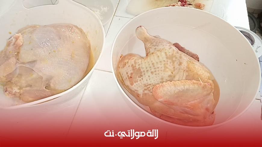 يمكنك سيدتي أن تقومي بخلط كمية من دقيق الفورص مع الماء والملح وضعي فيه الدجاج مدة 20 دقيقة بعدها قومي بغسله دون جهد كبير ستجدين أن كافة الشوائب العالقة بالدجاج من جلود ودهون وريش تزول بسهولة كبيرة وتحصلين على دجاج نظيف دون استغراق وقت طويل في القيام بهذه العملية.