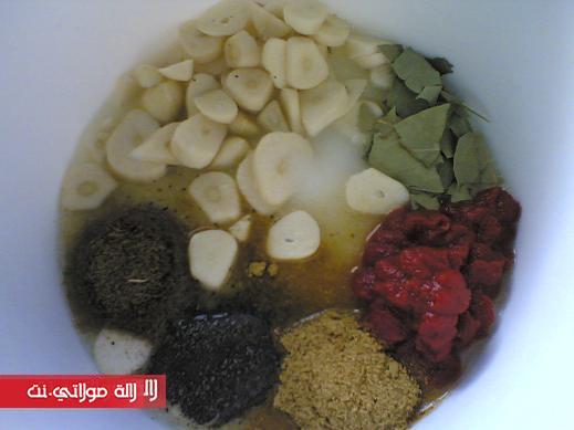 لحم وكركم ورق غار وشرائح الثوم في زبدية و نخلطهم مع بعض ثم نضيف قطع اللحم