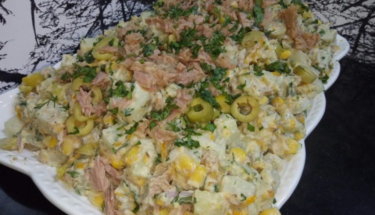 المكونات : كمية من البطاطس مقطعة مربعات +ذرة معلبة (ماييس) +علبة تونة + 2 ملاعق كبيرة قزبرة و معدنوس مفرومين + زيتون أسود مقطع دوائر + 2ملاعق كبيرة مايونيز +خل الليمون +فلفل أسود +ملح +زيت الزيتون للتزيين: بيض مسلوق.