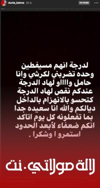 وكتبت دنيا بطمة عبر سطوري حسابها الشخصي على موقع إنستغرام: “مسيفطين وحدة تضربني لكرشي، واو حتى لهاد الدرجة عندكم نقص، لهاد الدرجة كاتحسوا بالانهزام، فالداخل ديالكم”.