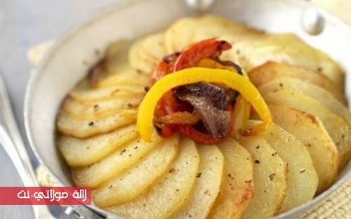 قشري البطاطس وقطعيها إلى دوائر رفيعة ومرريها تحت ماء ساخن. ابسطي الفلفل في قالب ثم شرائح البطاطس واسكبي الزيت واطهيها في فرن لمدة 20 دقيقة.
