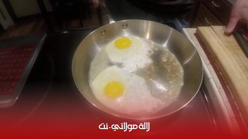 تدهن المقلاة الستانلس بمادة دهنية ( سمن او زيت او زبدة ) لتغطي كل القاعدة وتمسح بقايا المادة الدهنية بقطعة قماش او منديل ورقي وتمرر القطعة المبلله بالدهن على الحواف وتترك على النار لتسخن قليلا و نضيف البيض مثلا ويترك قليلا دون تحريك لينضح كما ستشاهدين في الفيديو التالي: