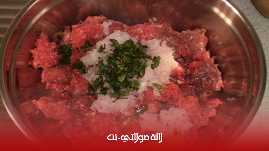ثم نخلط مفروم البصل، والبقدونس معاً في الخلاط الكهربائي حتى نحصل على مزيجٍ لين ننكه المزيج السابق بالملح، والفلفل الأسود، والهيل، وجوزة الطيب، والقرنفل، والقرفة مع التقليب الجيد نضيف مزيج التتبيلة السابق فوق اللحم المفروم، ونخلط المكونات مع بعضها بشكل جيد حتى نحصل على عجينة ناعمة.
