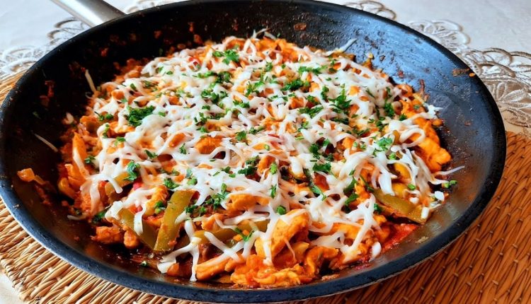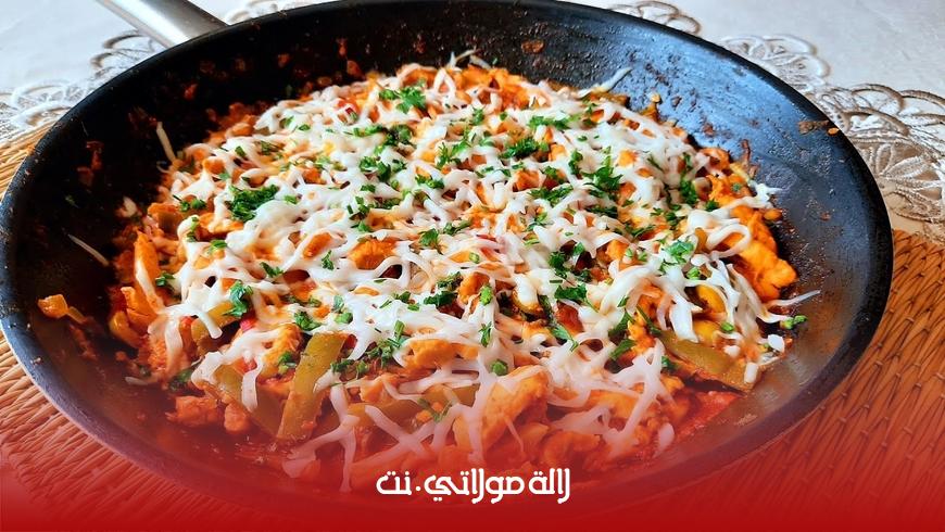 المقادير: بصلة مقطعة مربعات صغيرة+ فصوص ثوم مفروم+زيت الزيتون+نصف كيلو صدر الدجاج مقطع بشكل طولي (او حسب الرغبة)+ حبة فلفل أخضر مقطعة شرائح+ حبة فلفل أحمر مقطعة شرائح+فطر معلب (اختياري)+2 حبات طماطم محكوكة+ملعقة صغيرة+مركز الطماطم