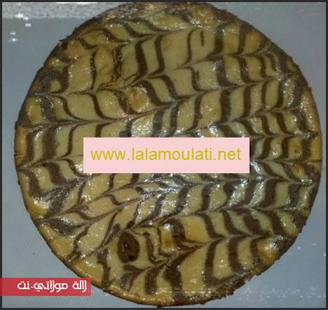 ثم نكبوا باقي الخليط فوق البسكوي ونعملوا فوقوا خطوط بالخليط دالشكلاط ثم ناخدوا موس نعملوابه زواقة الميل فوي بشكل عكسي وندخلها الفران طيب