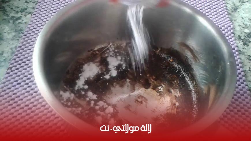 الطريقة:نخلط الصابون مع البيكاربونات،نطبق الخليط على الطنجرة نتركه قليلا ثم نفرك بليفة السلك (الجيكس) العملية لا تستغرق كثيرا ثم نغسل.