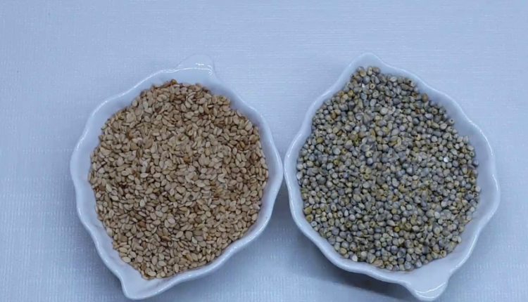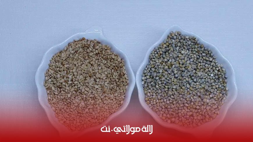 المكونات : كمية من حبوب ايلان مطحونة + كمية من السمسم أو الزنجلان المحمص والمطحون + كوب من الحليب كامل الدسم