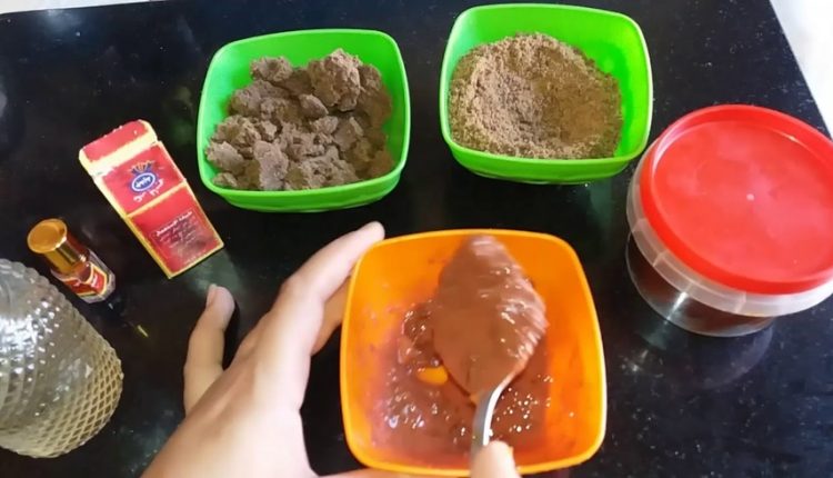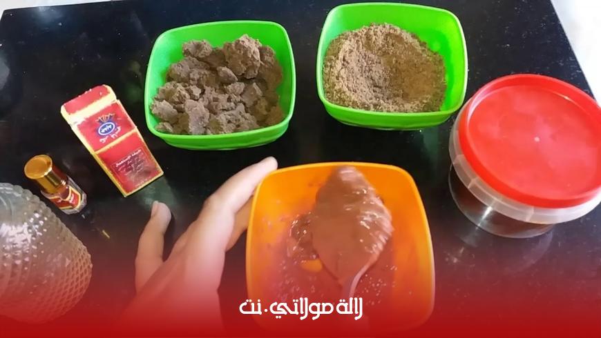 المكونات : ملعقتين من الحمص المطحون + ملعقتين من الفول المطحون + ملعقتين من الخزامى المطحونة + ملعقتين من الحناء الطبيعية + ملعقة من الحلبة المطحونة + ملعقتين من الصابون البلدي بالعكر الفاسي + ملعقتين من زيت جوز الهند .