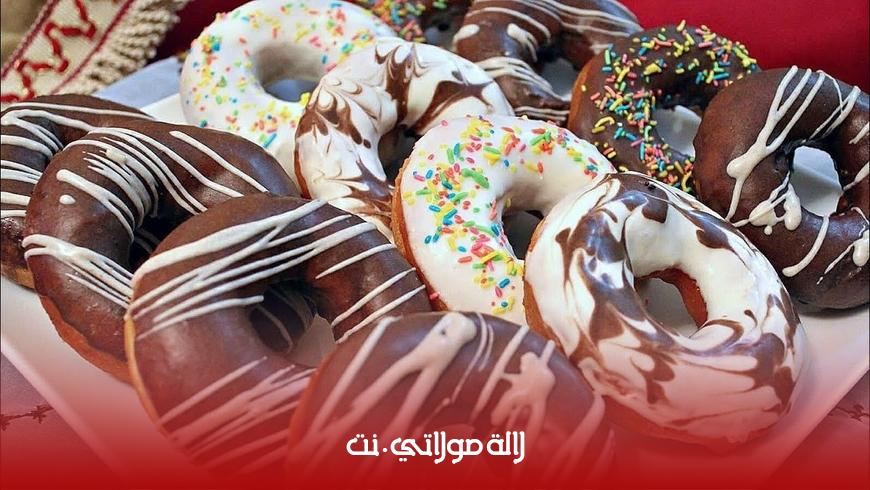 المكونات مطبخ حليمة الفيلالي كاس حليب=200 ملل بيضتان حجم صغير او بيضة كبيرة ملعقتين سكر خشن =50 غ 70 غ زبدة = 3 ملاعق كيس سكر فانيلا = 7,5 غ مبشور ليمونة حامضة كيسين من خميرة الحلويات بيكن باودر =16 غ ملعقة كبيرة خميرة الخبز القليل من الملح تقريبا 500 غ دقيق = 4 كؤوس ممكن اقل او اكتر التزيين شوكولا سوداء وبيضاء, شعرية الشوكولاطة فرميسيل