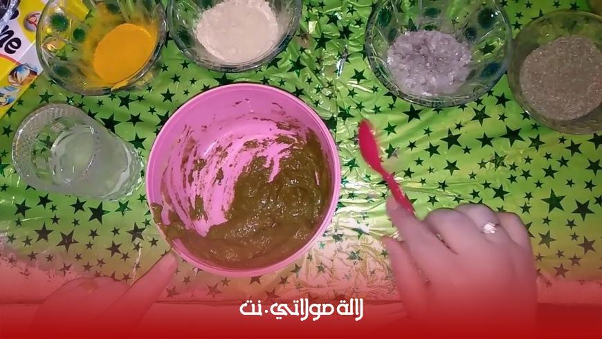 المكونات : ملعقتين من الحناء الطبيعية + ملعقتين من الازير مطحون + ملعقتين الخزامى مطحونة + ملعقة من قشور الكركاع مطحونة + ملعقتين من الحلبة مطحونة + علبة ياغورت طبيعي + ملعقتين من زيت الزيتون