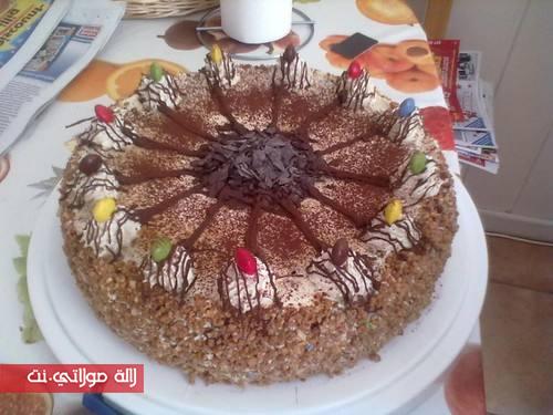 خديت البندق المحمص الواجد ودوزت على الجوانب ومن الفوق درت وريدات بالكريمة ودرت فوقهم حلوات ديال الشكلاط ملونين ودرت خطوط من الشكلاط الدائب وفي الوسط وعلى الوريدات الشكلاط محكوك ورشيت شوية الككاو