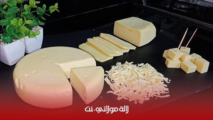 يمكنك سيدتي أن تعتمدي هذه المكونات كوبان من الحليب البودرة. كوب من الزيت، والماء. صفار بيضتين. حبتان من الفرماج المثلث. نصف ملعقة صغيرة من الملح. بضع قطرات من العصير الحامض بعدها يتم مزج جميع المكونات عدا الحليب والعصير الحامض في خلاط كهربائي، ثم إضافتهما بالنهاية تدريجيا حتى يصبح الخليط كثيفا. سكب الخليط في قوالب خاصة ومغلفة من الداخل بالبلاستيك الغذائي، ثم وضعها في وعاء وفي حمام مائي. ترك الجبنة في الحمام المائي على نار هادئة جدا، ثم إزالتها عن النار ووضعها في الثلاجة.