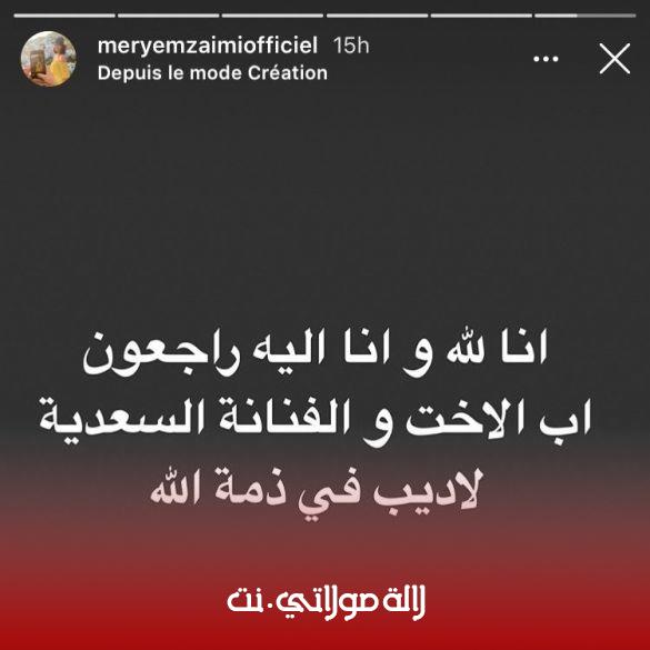 أعلنت الفنانة مريم الزعيمي يوم الجمعة المنصرم عن وفاة والد صديقتها وزميلتها الفنانة السعدية لديب.ونشرت الزعيمي عبر ستوري حسابها على الانستغرام، تدوينة أعلنت من خلالها هذا الخبر المفجع، ولكن دون أن تكشف عن تفاصيل الوفاة.