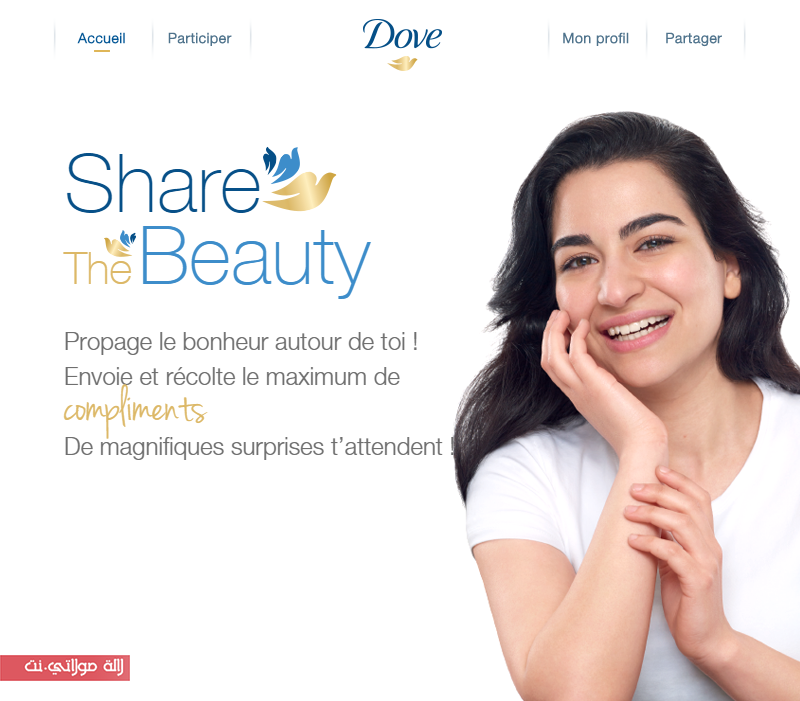 تطبيق “Dove “Share the Beauty متوفر على صفحة الفيسبوك Dove Maroc، يمكن لمستخدميه من تبادل الملطفات مع أحبابهم و اصدقائهم ، نشر السعادة من حولهم و اللمشاركة في القرعة للفوز بجوائز قيمة.