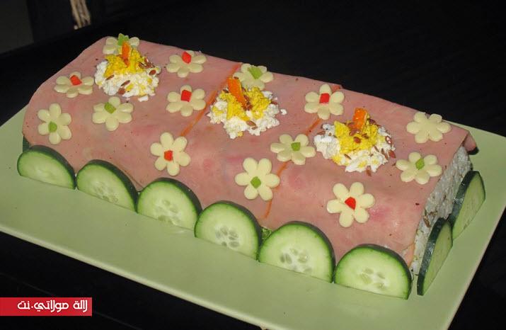 نضيف إلى الأرز الجبن وقليل من الحبق مقطع والزعتر و الخل والفلفل الأسود والمايونيز نمزج الخليط جيداً. في قالب مستطيل مغلف بالبلاستيك الغذائي نضع شرائح الديك الرومي ثم نضيف نصف كمية خليط الأرز تبسط جيداً بملعقة ثم نضيف قطع الطماطم والفاصولياء (المصلوقة من القليل من الملح) ثم يغطى الكل بكمية الأرز المتبقية. ندخل القالب إلى الثلاجة ساعتان تقريباً. ثم يقلب في إناء التقديم ويزين بوريدات من الجبن وقطع الفلفل الأحمر والأخضر والبيض المحكوك وتقدم السلاطة باردة بالصحة والراحة.