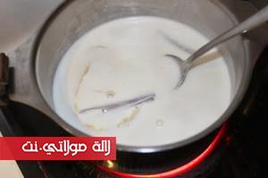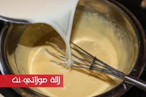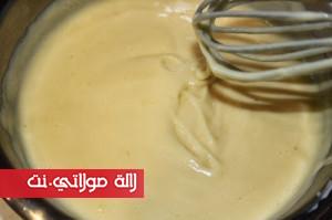 نزيل من الحليب القرفة وقشرة الليمون ثم نضيف الحليب شيئاً فشيئأً إلى خليط أصفر البيض نمزج جيداً، ثم نضع الإناء فوق حمام مريم نحرك الخليط باستمرار لمدة 10 إلى 15 دقيقة حتى نحصل على كريم عاقد كما في الصورة.