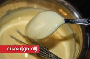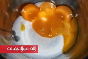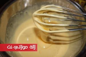 في إناء آخر نضع نصف كمية السكر المتبقية مع أصفر البيض وقبصة الملح نمزج جيداً حتى نحصل على لون يميل للأبيض، ثم نضيف مايزينا، نستمر في الخلط بالطراب اليدوي حتى نحصل على كريم.