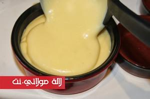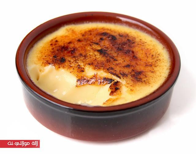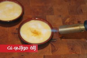 نصب الكريمة في قوالب فردية، ندخلها للثلاجة 4 ساعات. قبل التقديم يرش الوجه بسكر سنيدة ثم يحرق بواسطة الشعلة أو يدخل للفرن لمدة تقل عن 5 دقائق (النار في الأعلى فقط) ثم يدخل للثلاجة إلى حين تقديمه.