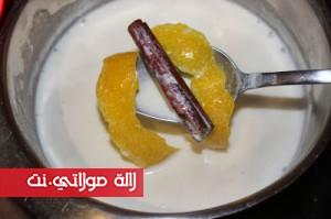في كاسرول نضع الحليب مع نصف كمية السكر(45غ) وقشرة برتقالة و عود القرفة ثم الفانيلا السائلة (ملعقة صغيرة) نترك الكل على نار هادئة حتى يغلى الحليب ثم نزيله من النار، نتركه جانباً.