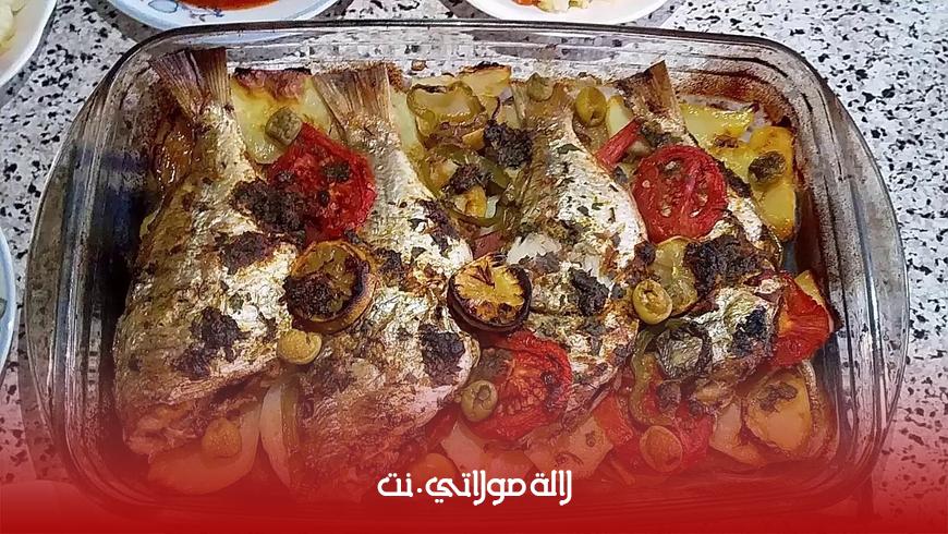 ونطحن المكونات عدة دقائق حتى نحصل على صلصة متجانسة. نسكب نصف المزيج السابق فوق السمك. ندخل الصينية الفرن مدة عشرين إلى ثلاثين دقيقة حتى ينضج السمك. نخرج السمك ونسكب فوقه كمية الصلصة المتبقية.
