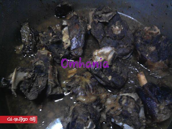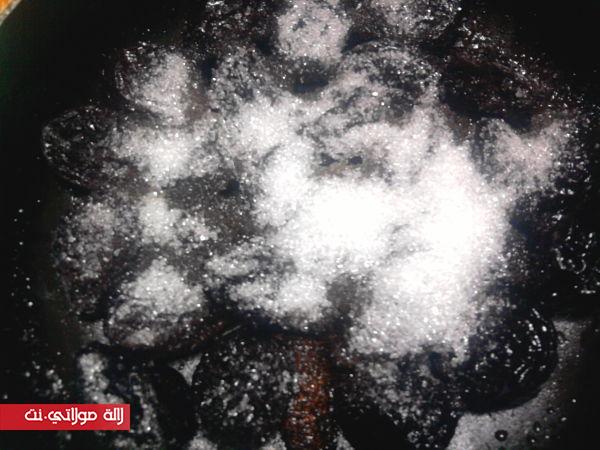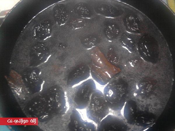 ثم كنوجدو البرقوق كناخدو المرقة من اللحم أثناء الغليان ونطيبو فيه البرقوق لي كنكونو فزكناه بالماء الساخن باش تزول لكحولة و كنوضعو القرفة عواد على البرقوق ثم السكر أو العسل ونعسلو البرقوق مزيان